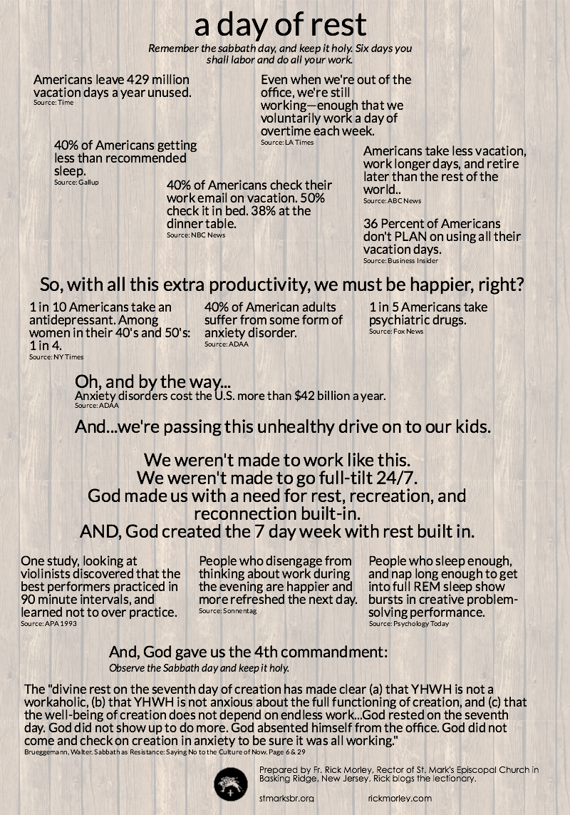 This Sunday (Proper 22a) we have the 10 Commandments in Exodus 20. I’ve been doing a lot of thinking about Sabbath these days…particularly in the sense that as a culture we don’t get any…. and I’m going to be preaching on that this Sunday. Walter Brueggeman’s recent book “Sabbath as Resistance” is amazing, and I recommend it highly.